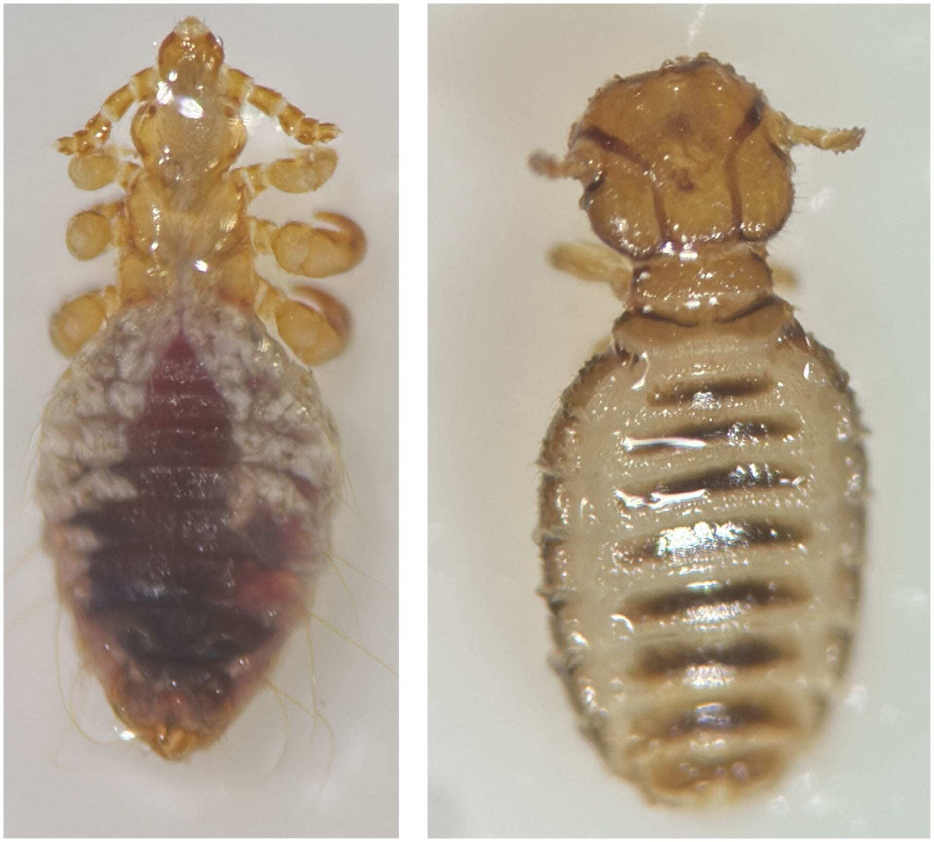 Identifying which lice type you have can be important as it may direct your insecticide choice. As a general rule, biting lice have large, dome shaped heads while sucking lice have more narrow, tapered heads (Figure 2). Only one species of biting lice impacts cattle (cattle biting louse, Bovicola bovis, Figure 1), with females being able to reproduce without mating. This is the most predominant lice species impacting cattle and is commonly found on adult animals especially along the back line of the animal and around the wither area. Four species of sucking lice impact cattle in the US, three of which are not common on the Great Plains region [little blue cattle louse (Solenopotes capillatus), shortnosed cattle louse (Haematopinus eurysternusis), cattle tail louse (Haematopinus quadripertusus)].