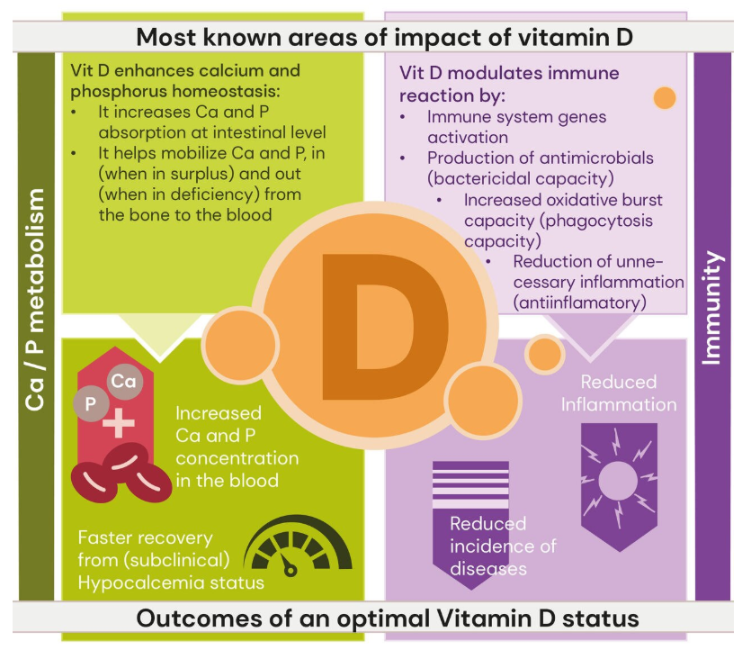 Both major known areas of impact of vitamin D – calcium and phosphorous metabolism and immunity - play a very important role on the health of the animals. Consequently, the energy balance results in the greater milk production capacity.