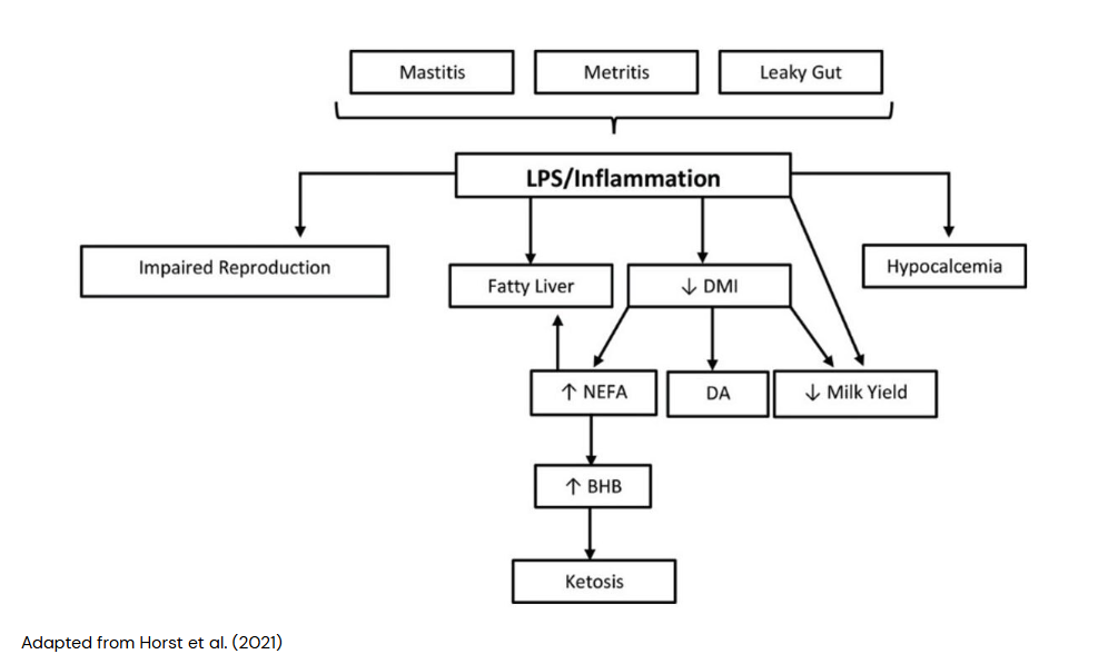 Root cause of diseases: Pathological inflammation can be harmful because it may act as the starting point of several diseases, as suggested by Horst et al. (2021). Inflammation commonly can result in failures such as fatty liver, ketosis, hypocalcemia, impaired reproduction and others. Any one of these diseases will limit the wellbeing of the cow and will limit her capacity to express her productive potential.
