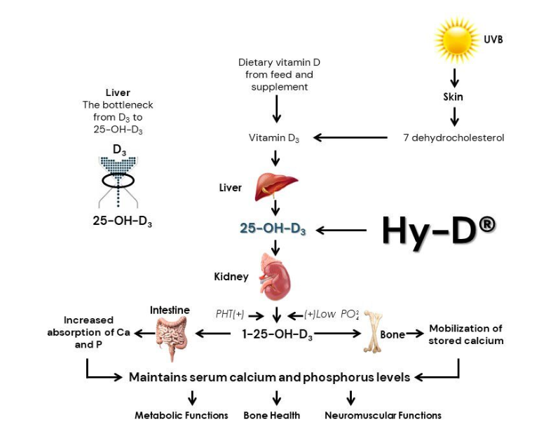 Supplementing with products such as Hy-D® supports the cow in the metabolism of vitamin D3. It bypasses the critical first step of hydroxylation in the liver and reaches the blood stream quickly and efficiently. The key advantage of Hy-D® as a vitamin D source is that it bypasses the liver’s bottleneck and ensures the animal can reach blood levels associated with optimal immune function (Nelson et al., 2010).