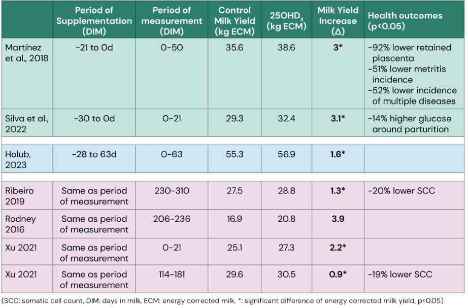 Table 1. Summary of scientific trials with 25OHD3 supplementation on dairy cows and its impact on milk yield and health outcomes.