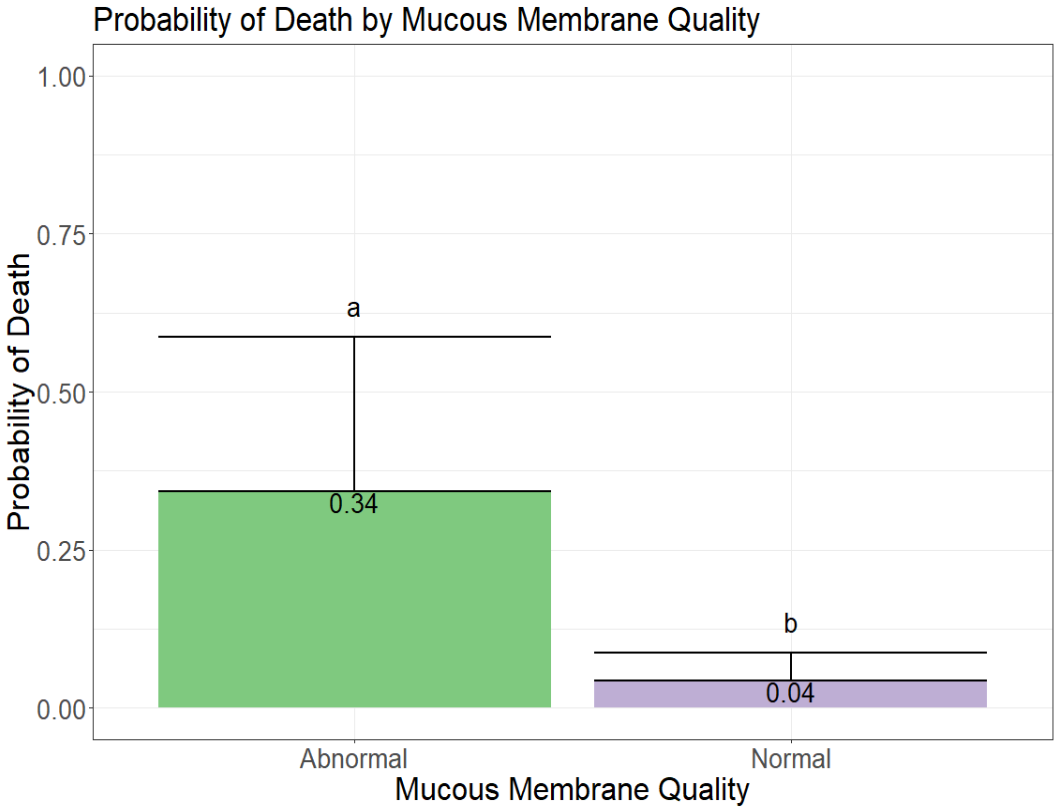 In this study, cattle with normal mucous membranes (pink, warm, and moist to the touch) were less likely to die later on in the feeding phase when compared to cattle with an abnormal mucous membrane quality (differing superscripts indicate a statistically significant difference). This means that evaluation of a sick animal's mucous membranes could help determine outcome of disease.