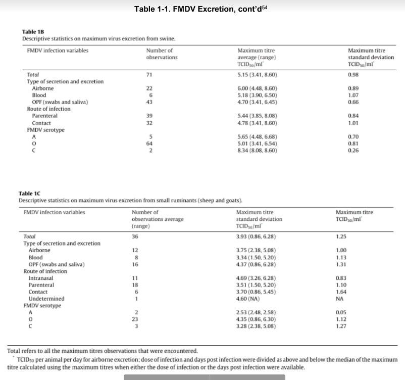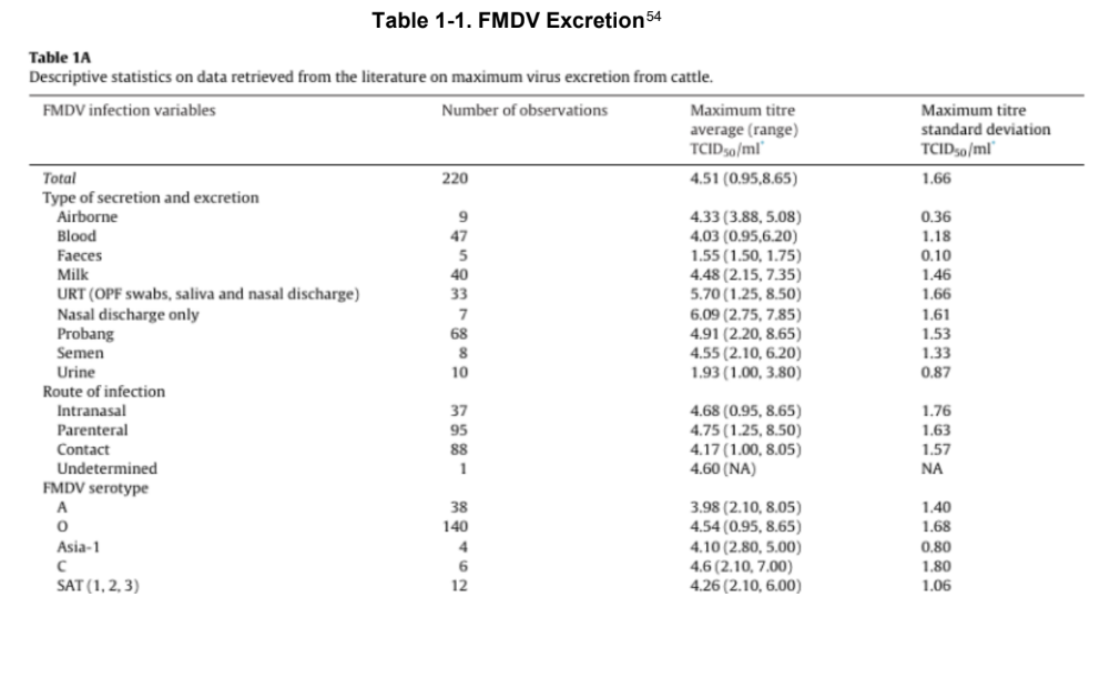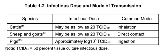 Different animal species vary in their susceptibility to FMDV, which is also influenced by the route of infection. Table 1-2 lists the infectious dose and mode of infection for key animals, given the primary mode of transmission for that species.