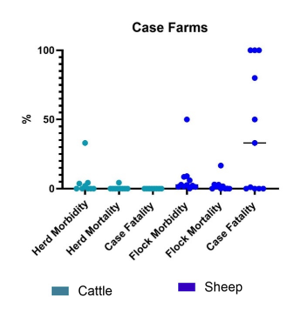 Data is still being compiled but based on survey returns from farms that had clinical signs you can see in figure 1 that sheep were more severely affected in terms of mortality and morbidity.