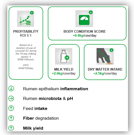 6 litres of extra milk, partly explained by a higher DMI of 2.5 kg/head/day. This higher DMI was equivalent to a higher non-fibre carbohydrate (NFC) intake in the LEVUCELL SC group of 1.21 kg, equivalent to an extra 20%, corresponding to a higher energy supply. The overall benefits of supplementing LEVUCELL SC are summarized in Figure 2.