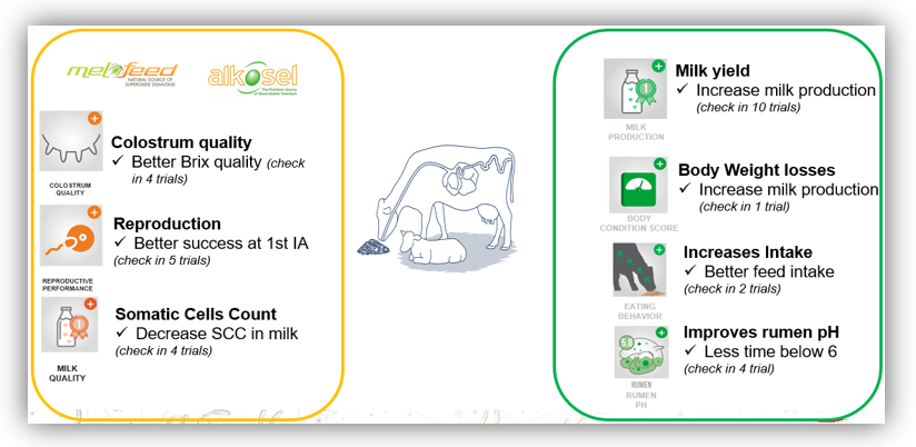 In an interesting study conducted in multiple commercial farms in Europe, the combination of the probiotic yeast S. cerevisiae CNCM I-1077 with MELOFEED and Alkosel antioxidants (fed 3 weeks before to 3 weeks after calving), increased milk production, body condition, colostrum quality, fertility parameters and improved rumen pH (Figure 3; key findings during early lactation).