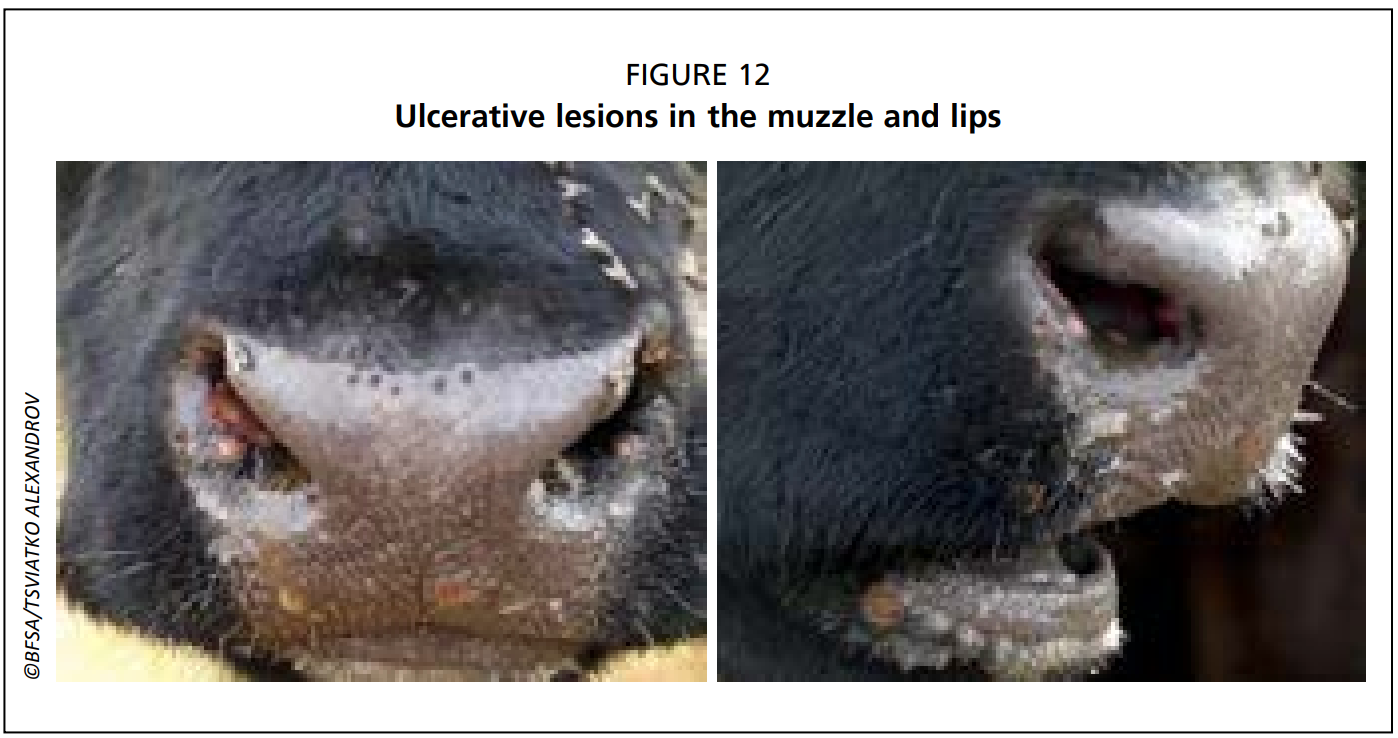 - Necrotic plaques in the mucous membranes of the oral and nasal cavities cause purulent or mucopurulent nasal discharge and excessive salivation, containing high concentrations of virus (Fig. 12).
