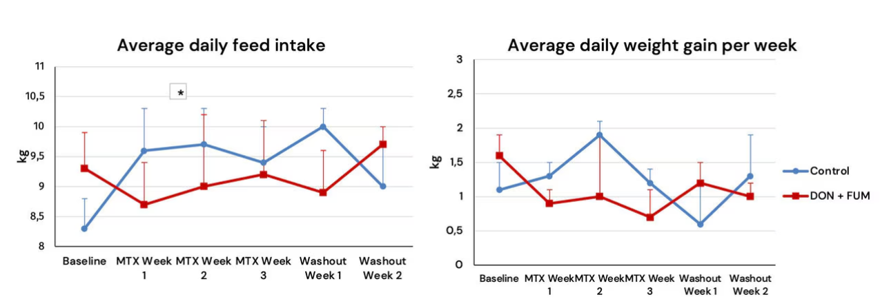 During a study conducted by Duringer (2021) at Oregon State University, the impact on feed intake was evident when comparing the diets of two different groups of beef steers, as seen in Figure 1. The intake of fattening steers started better for the control animals than those with contaminated diets. Still, quickly after the treatment, the mycotoxins suppressed the intake of the treated animals. The DMI reduction resulted immediately into a decreased weight gain compared to the control.