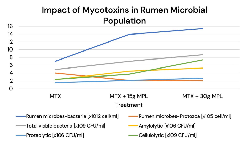 Mycotoxins disrupt the typical functioning of the microbiota inhabiting the rumen, which is essential for achieving optimal fermentation and feed digestion. As their name implies, mycotoxins are toxic substances that apply an antimicrobial effect, inhibiting the normal activity of the rumen. In Figure 2, we can observe the influence of contamination by multiple mycotoxins on the presence of various microbial groups within the control group, which significantly dampens their activity. However, the supplementation of Mycofix® at two different dosages proved effective in protecting the microbes from the adverse effects of mycotoxins and, as a result, there was a restored microbial growth and activity when compared to the diet contaminated with mycotoxins.