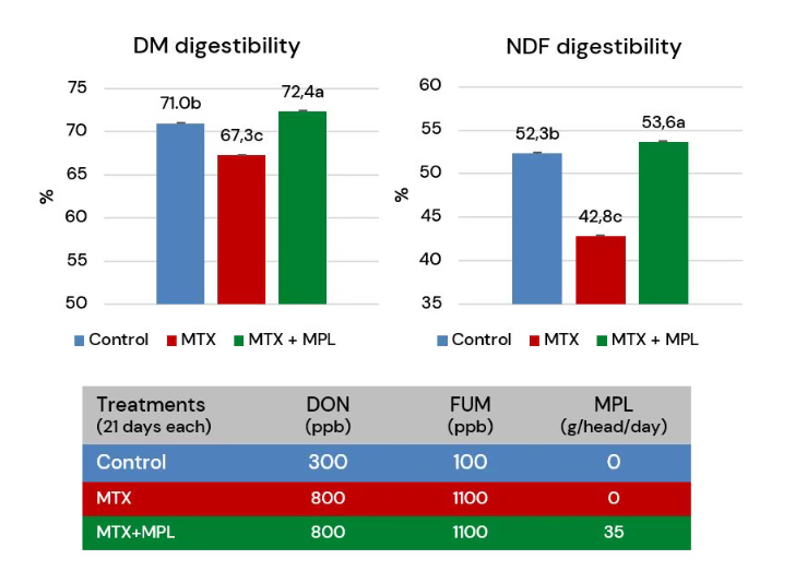 During a trial conducted by Gallo et al. (2021) with relatively low contamination of deoxynivalenol and fumonisins on high-yielding dairy cows, the digestibility of dry matter (DM) and neutral detergent fiber (NDF) was greatly reduced. Thanks to the protective effect of Mycofix® the digestibility was recovered to a level even higher than control (p<0.05), which means that there is an advantage of deactivating mycotoxins even if contamination is very low (control levels).
