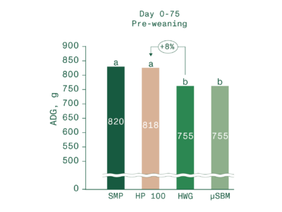 Analysis of growth data revealed clear advantages for HP 100. Calves fed milk replacers containing HP 100 matched the growth of calves on dairy-only replacers during the pre-weaning phase (Figure 1).