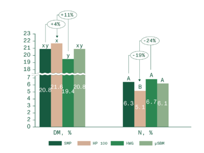 This trial also evaluated the impact of protein choice in CMRs on fecal parameters (Figure 2). While pH remained unaffected, calves fed HP100 showed drier feces (higher dry matter, DM %) and significantly lower nitrogen (N %) compared to other treatments.