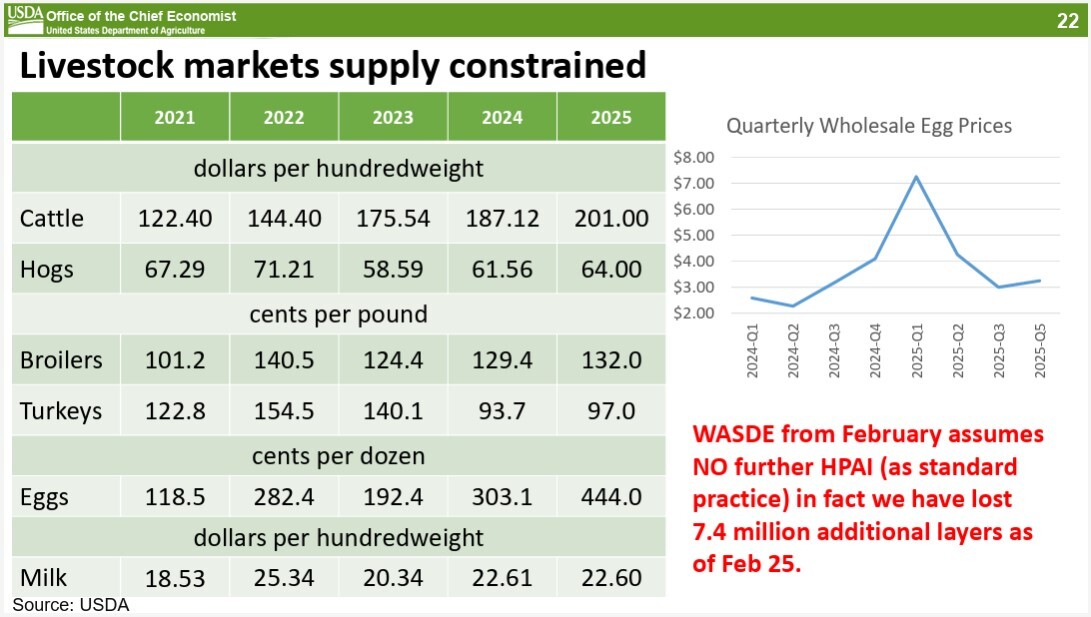 Livestock pricing expectations, including a focus on the layer & egg marketIn his 2025 Agricultural Outlook Forum presentation, USDA Chief Economist Seth Meyer provided insights into the current trends and challenges facing the livestock industry, with a particular focus on the egg market.