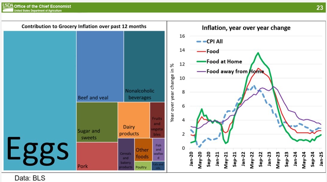 Despite these challenges, Meyer pointed to broader trends in food price inflation, showing that while overall food price increases have moderated, eggs continue to be a major driver of inflation.
