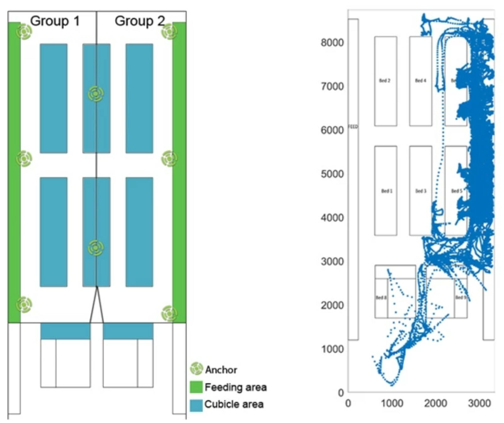 Cows that are allowed to roam freely indoor, in a barn, spend their time resting, walking, standing, feeding and visiting the milking robot. Their individual behavioral patterns and social activities are important for cow welfare and for avoiding disease outbreaks.