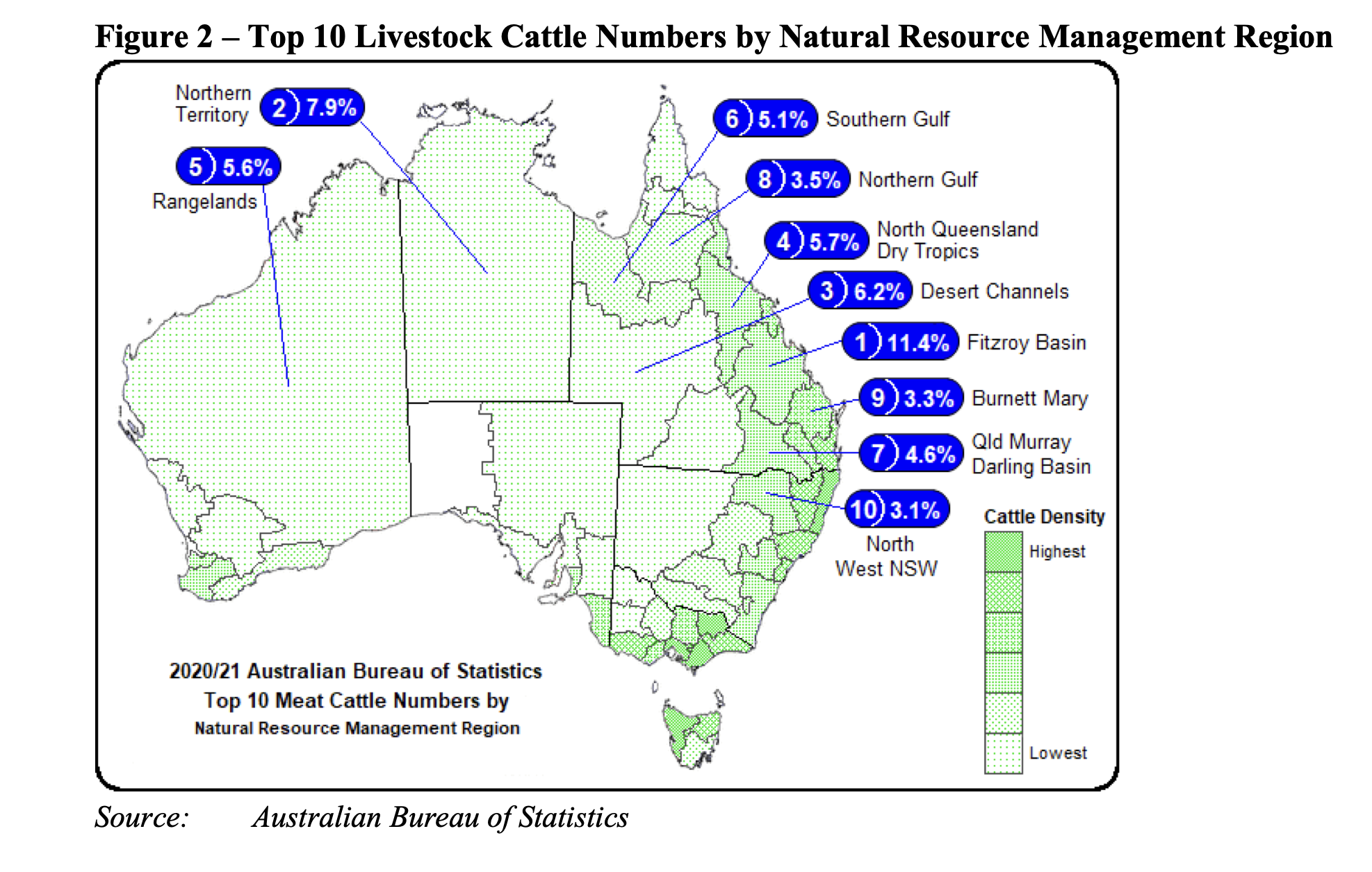 Seven of the top ten beef producing regions are located in Queensland and rainfall in the first seven months of 2023 for central and northern Queensland, the Northern Territory and northern Western Australia has been well above average after exceptional wet season rainfalls. This is a positive scenario in relation to cattle production, particularly for the northern parts of Australia.