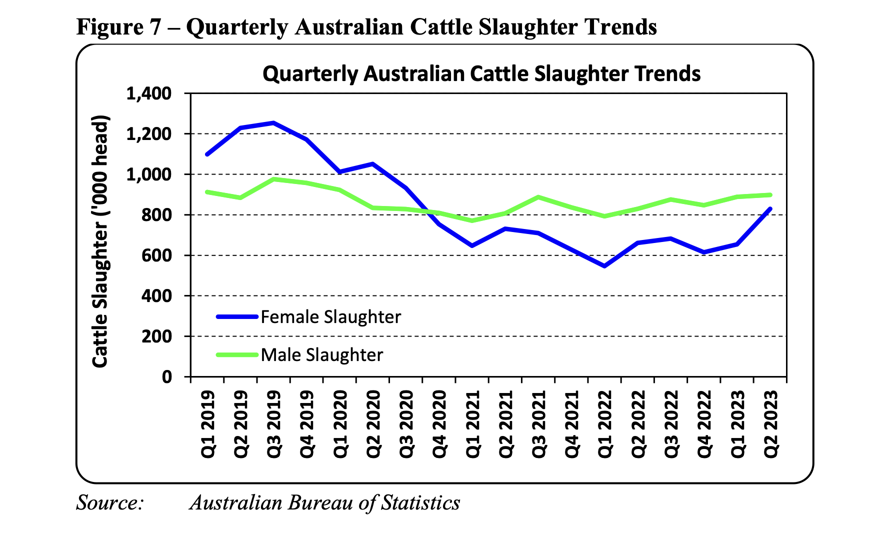 These areas are dependent upon spring rainfalls to produce grass feed and carry cattle through the summer and into the fall of 2024. A shortfall of grass feed may result in an uplift in cattle sent to feedlots to reduce stocking rates and finish cattle for processing sooner, particularly from central and northern New South Wales and southern Queensland which have been drier than usual so far this year. This would slightly lift the cattle slaughter number for the final quarter of 2023 and reduce the growth