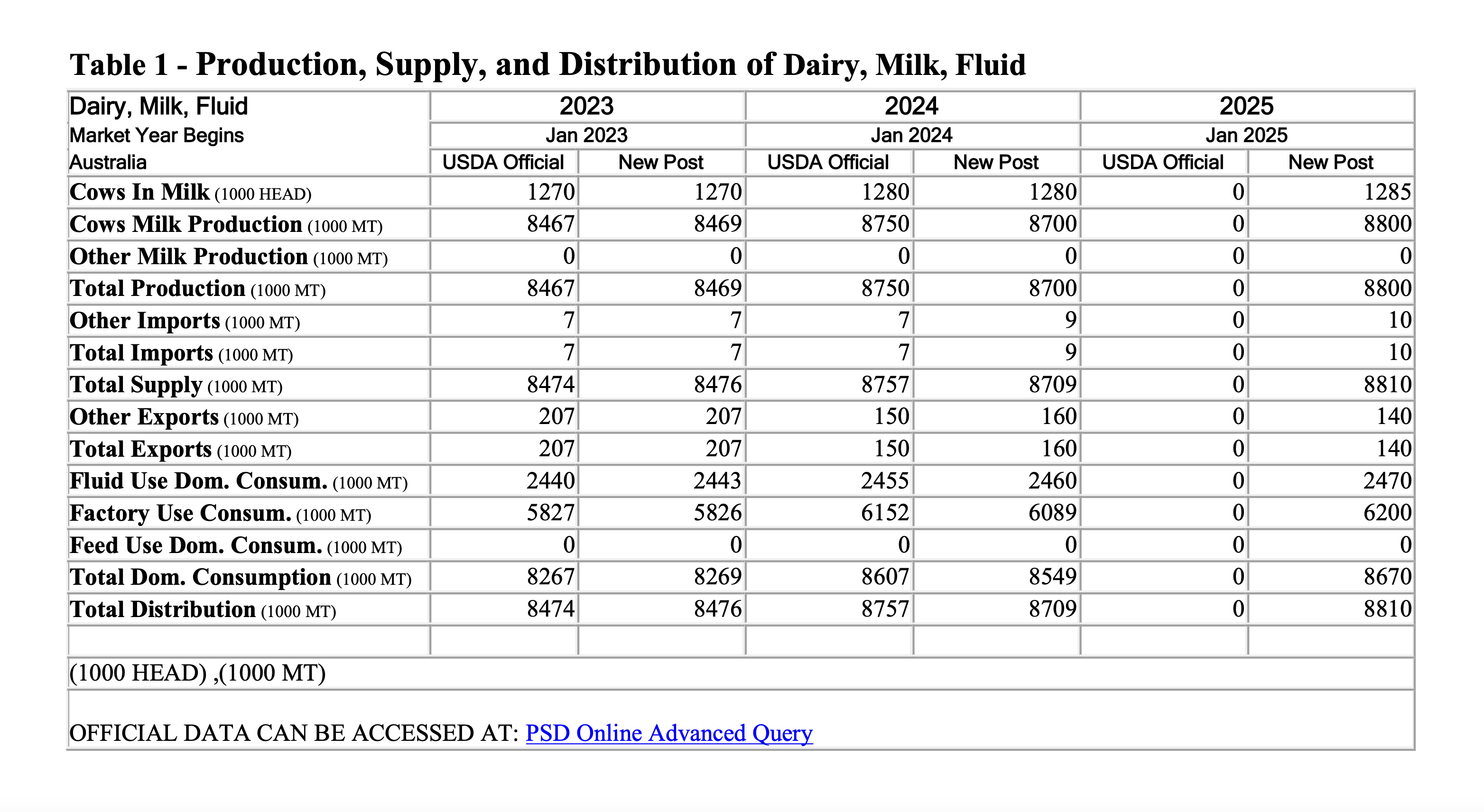 The increase will only be slight thoughAustralia's fluid milk imports remain relatively low but are forecast to increase slightly to 10,000 metric tons (MT) in 2025, according to a recent US Department of Agriculture (USDA) Global Agricultural Information Network (GAIN) report.