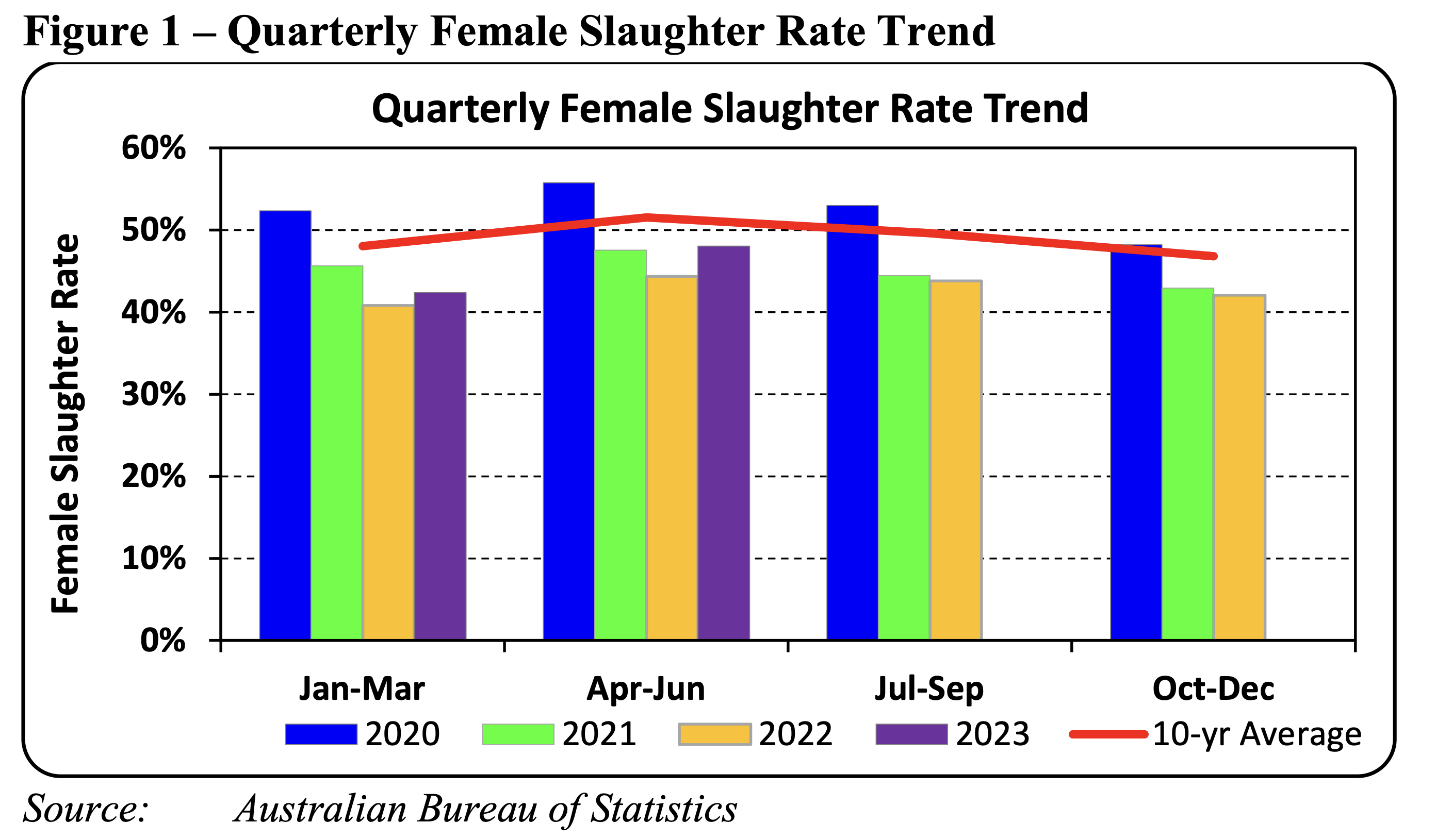 Female slaughter rates are anticipated to return to around long-term average levels in 2024 after the trend of low slaughter rates in 2021 and 2022 began to moderate from the start of 2023 and in particular the second quarter of 2023. This marks the start of the slowdown in the growth of Australia’s beef herd which is expected to continue into 2024.