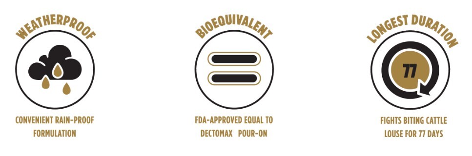 Doracide is a convenient weatherproof formulation and controls 33 types of internal and external parasites including gastrointestinal roundworms, lungworms, eyeworms, grubs, horn flies, mange mites and sucking lice in cattle.