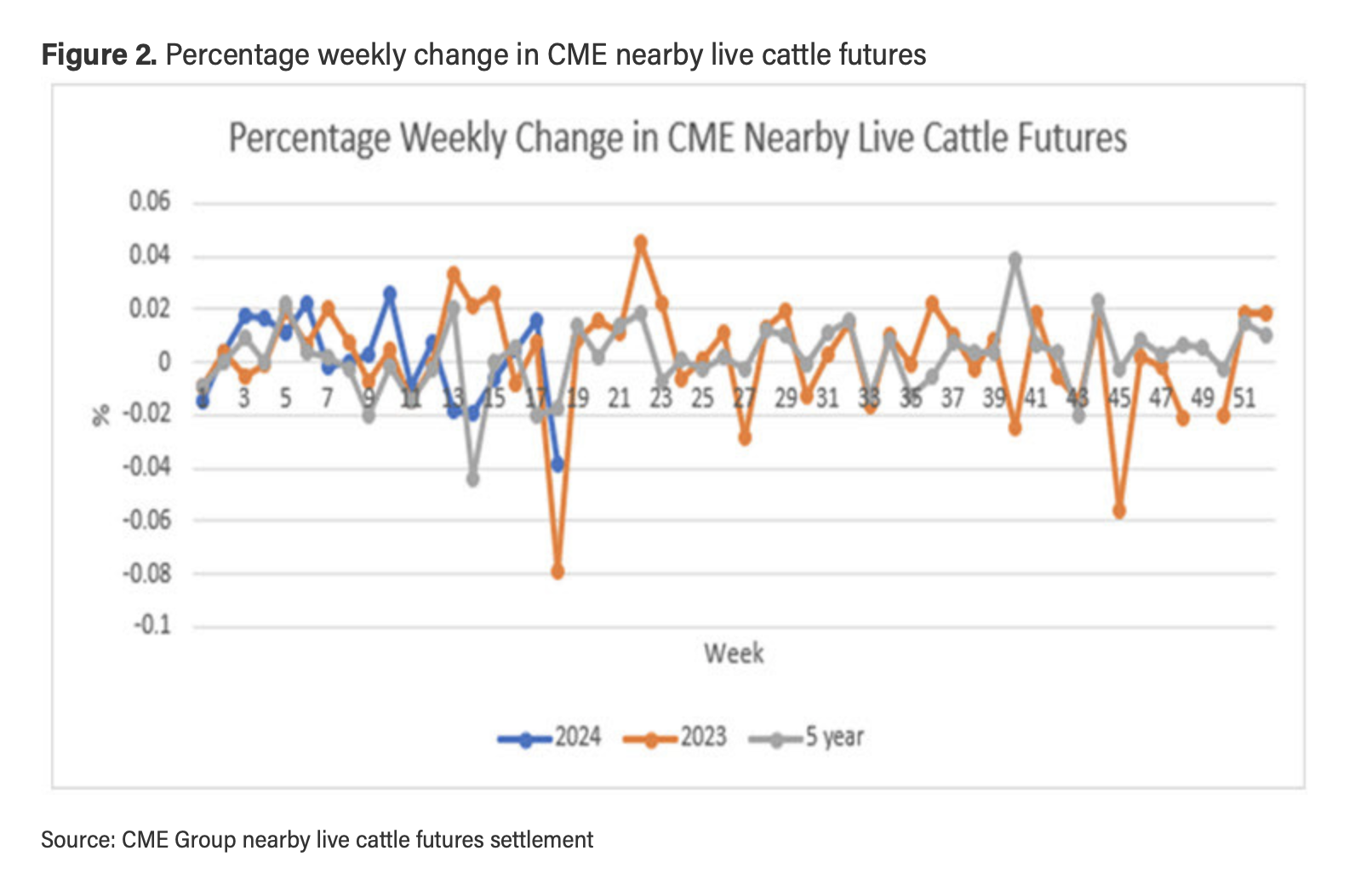 A closer look at the weekly percentage change in CME live cattle futures prices for the contract month closest to expiry (nearby) reveals the volatility experienced over the last year. More volatile prices imply a greater degree of risk. The annual standard deviation of live cattle future contract prices estimates 2023 volatility being the highest over the last 5 years, except for 2020.