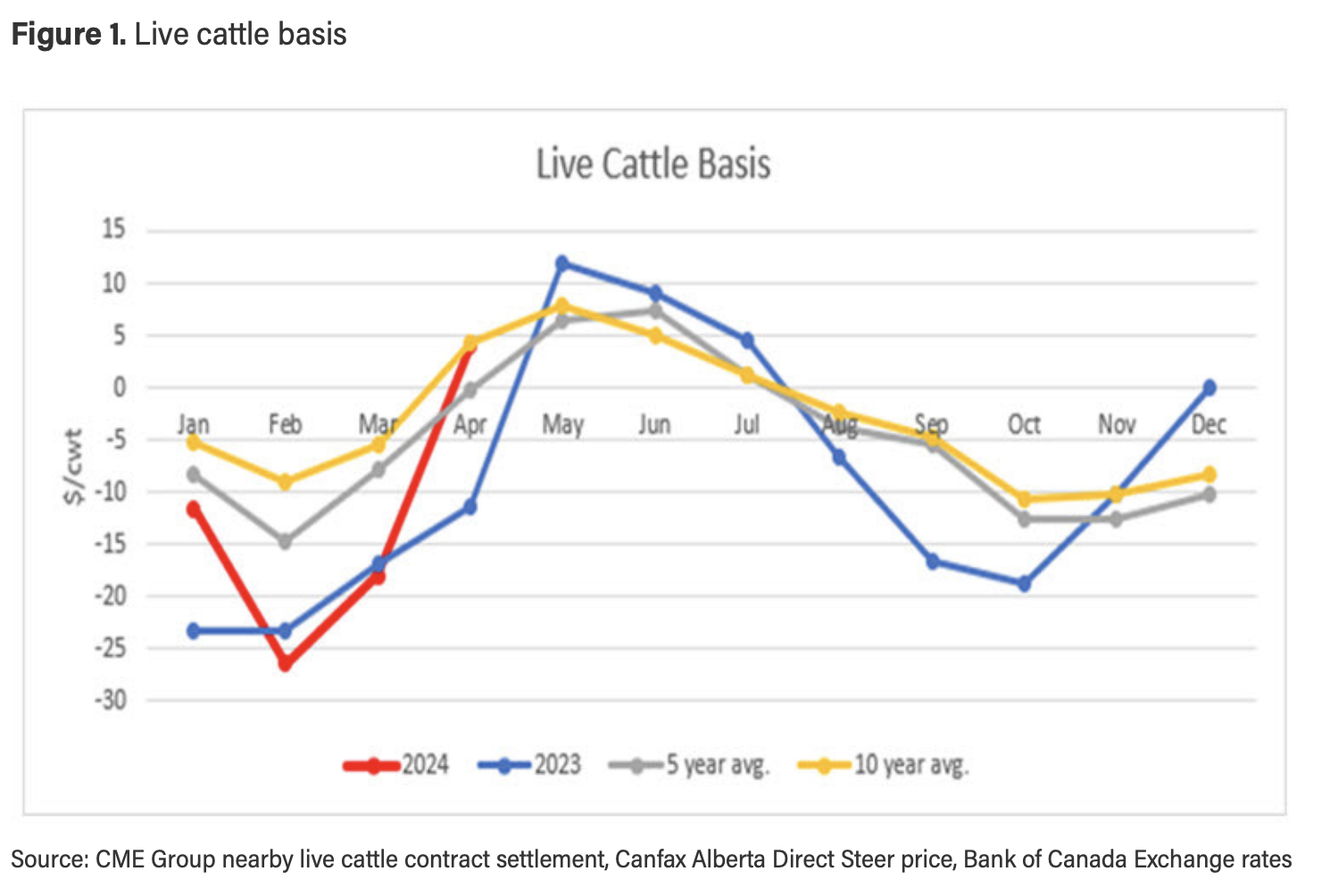 “For example, with a majority of the cow herd on a spring calving system, supplies of weaned calves are greatest in the fall and ready for slaughter the next summer. Thus, feeder cattle basis is strongest in spring and typically weaker in fall to early winter, whereas live cattle basis is stronger in spring and summer. Historical basis data can be used as an indicator to help forecast future basis levels.”