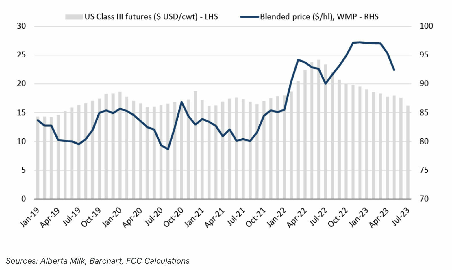 Canadian producers ‘rode the wave’ of strong US milk prices in 2022 but are now beginning to see downward pressure on domestic prices as the US situation worsens, said senior analyst Graeme Crosbie. In May 2023, the average blended price in the Western Milk Pool (WMP) was $92/hl, unchanged from May 2022 despite two Canadian Dairy Commission increases in the butterfat support price. The biggest reason: US Class III milk prices declined 30% during that time.
