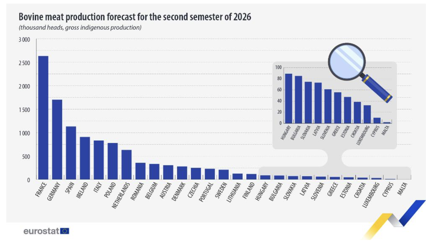 Pigs are the exception. EU production is forecast to rise 3.2% in the fourth quarter of 2026, led by Spain (+12.0% to 15.8 million head), with Germany, Denmark and France also expected to post gains.