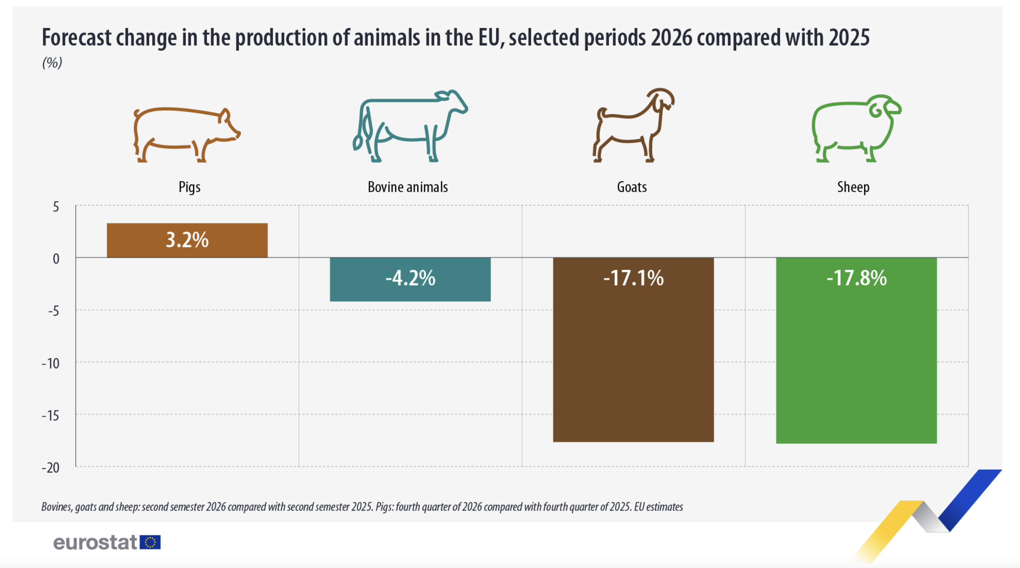 Eurostat forecasts a broad decline in EU livestock production in 2026, with sheep and goat numbers set to fall most sharply, though pig production is expected to swim against the tide, according to Eurostat.