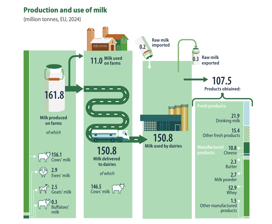 Raw milk production on European Union farms reached an estimated 161.8 million tonnes in 2024, up 0.6% from the previous year, according to Eurostat’s Key figures on the European food chain – 2025 edition.