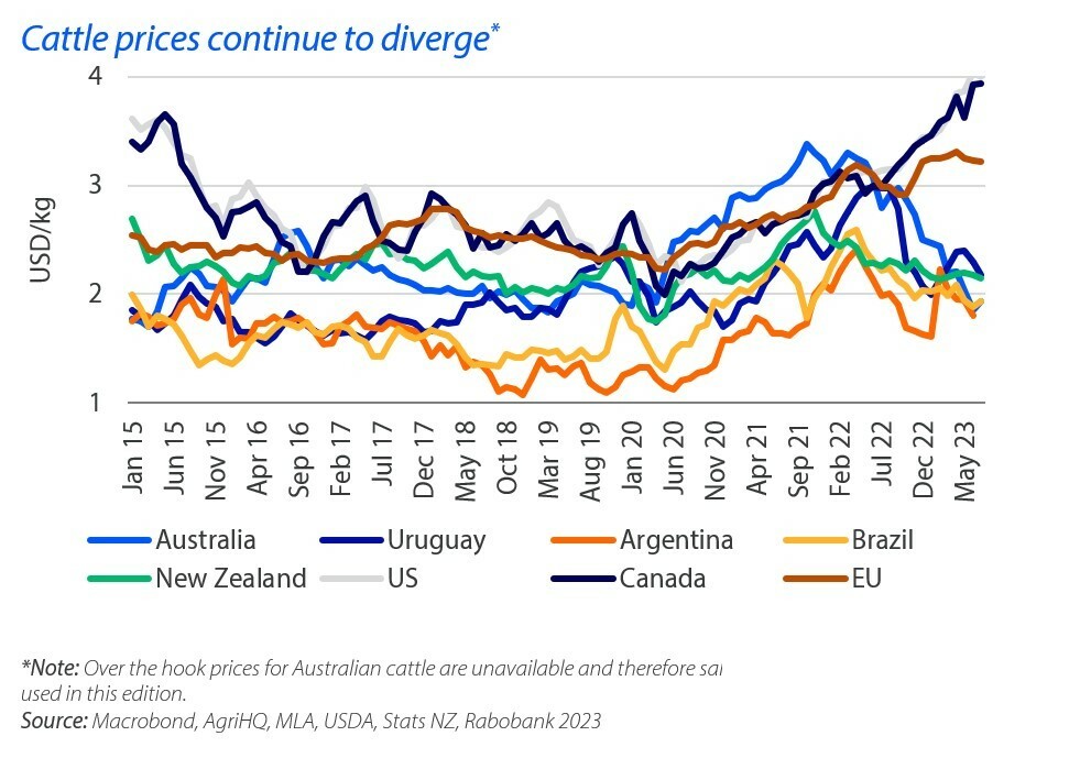 Compared to 12 months ago, US cattle prices have increased almost 30%, whereas Australian cattle prices have dropped by more than 30%.