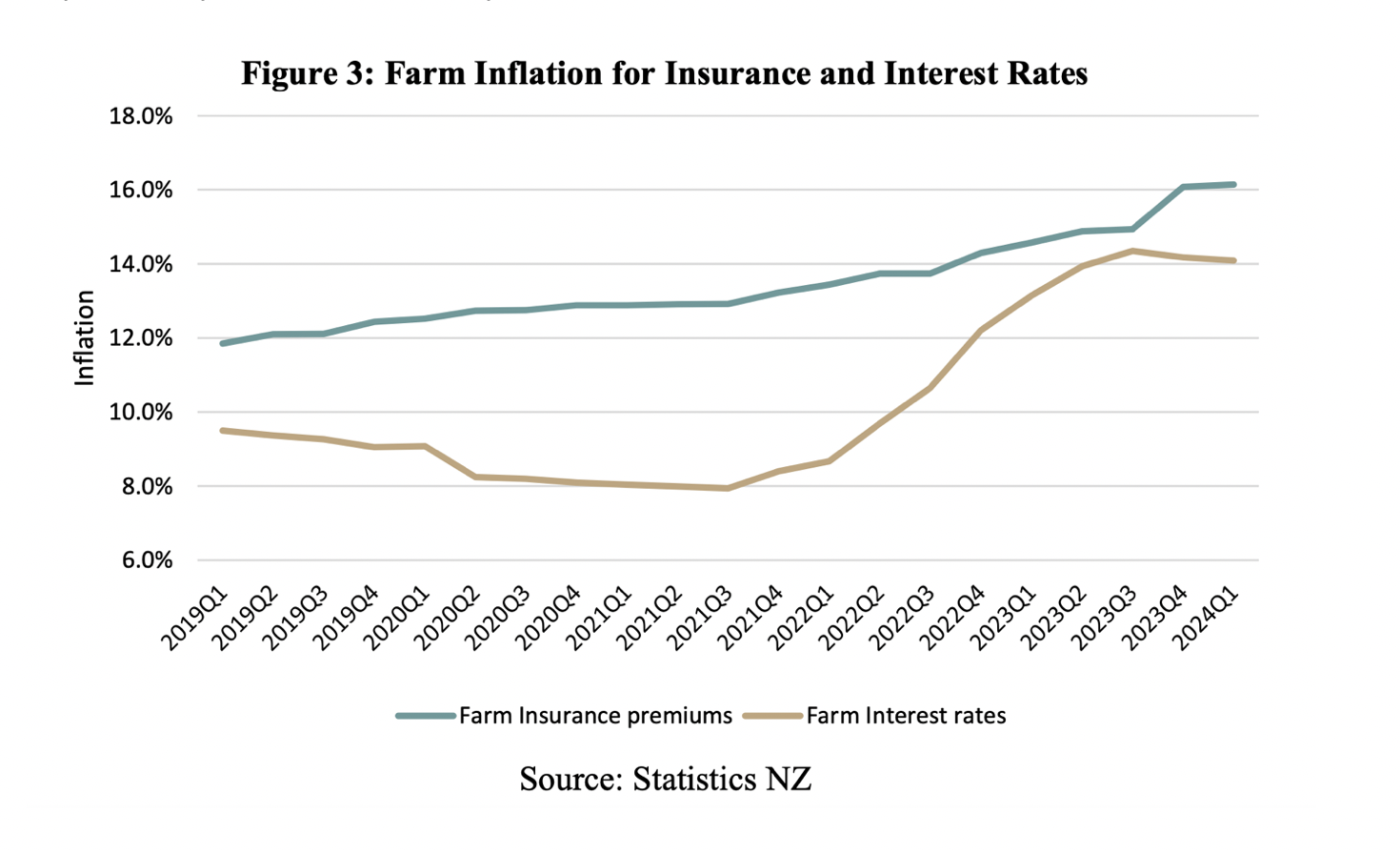 Prices for farm inputs increased 30.8% over the last five years. In 2023, interest rate increases had the biggest effect on on-farm inflation for all farming operations. However, recent industry reports forecast insurance premiums will have a more substantial impact, which in the first quarter of 2024 has risen 11% on the same time last year following the impacts of Cyclone Gabrielle early in 2023.