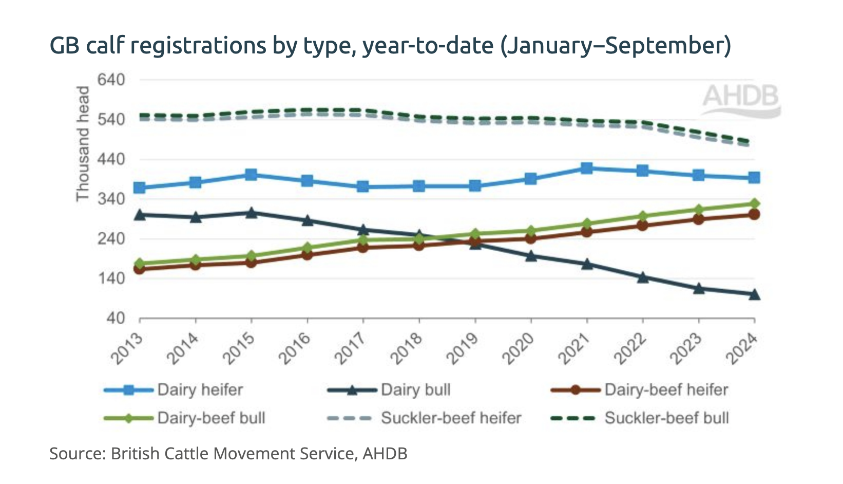Cattle inventory data from the start of the year pointed to a 1% increase in the number of prime animals available for beef production in 2024. This was influenced by increases in dairy-beef calf registrations in previous years. Data suggests that 37% of prime cattle slaughtered in GB in 2024 were classed as dairy-beef, up from 35% in 2023, and up from 28% in 2019.
